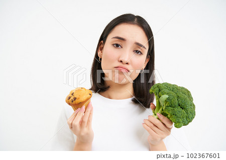 Woman with sad face, holding vegetable and pastry, upset being on diet, choosing broccoli instead of cupcake, white background