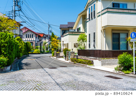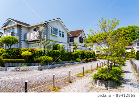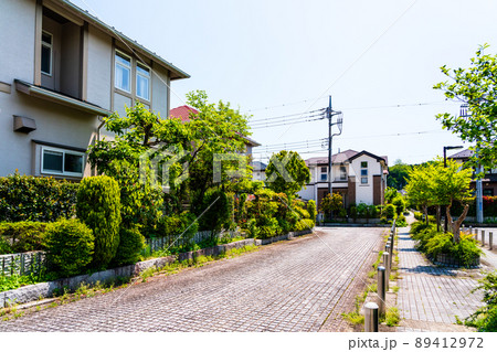 緑と花の多い郊外の戸建住宅団地 道路にブロックを敷き詰めた高級感のある閑静な住宅街