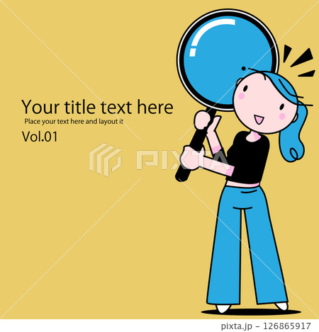 可愛い女性のちびキャラが検索のポーズをしている