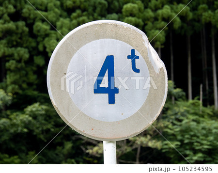 色あせや損傷がみられる道路標識。本標識(規制標識)「重量制限」。