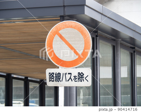 曲がり、傷付き、色あせ、傾いた道路標識(規制標識「駐車禁止」)。