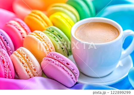 A coffee cup paired with neatly arranged colorful macarons, showcasing a mix of gentle pastel tones