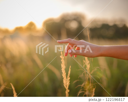 woman's hand touching wheat ears, close-up of fingers holding grain, delicate hand in field of wheat, golden hour macro shot of wheat, sunlight on woman's hand