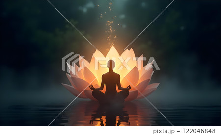 Silhouette of a person meditating in lotus pose with glowing lotus flower on a dark background
