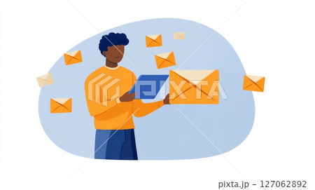 Man Checking Emails on Tablet with Multiple Envelopes Surrounding Him