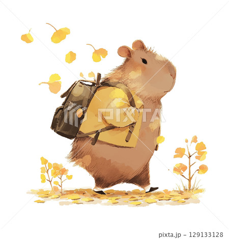 Cute animal with a backpack walking through autumn leaves in a vibrant landscape filled with flowers