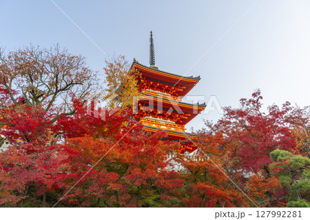 紅葉に包まれた秋の清水寺の三重塔