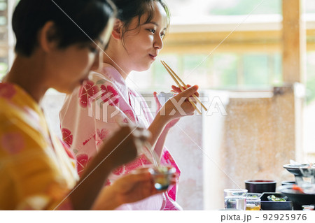 友達と温泉旅行を楽しむ浴衣姿の女性