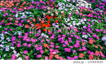 vivid multicolored Impatiens walleriana blooming flowers on a flower bed in garden in summer. Beautiful colorful floral background