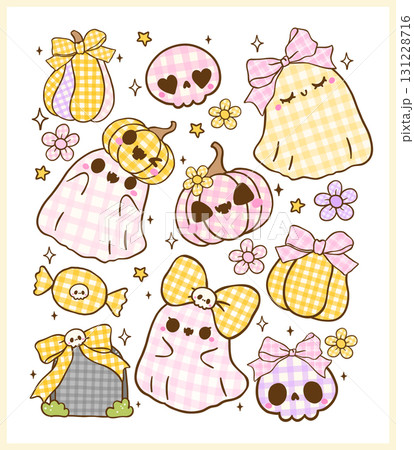 Coquette Girly Halloween Ghosts Spooky Cute Gingham with Bow Kawaii Cartoon Hand Drawn Collection