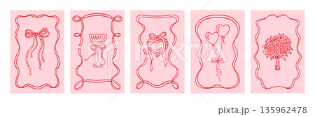 Romantic set of cute valentines day cards with decorative icons. Coquette aesthetic templates with hearts and bows. Hand drawn illustration.