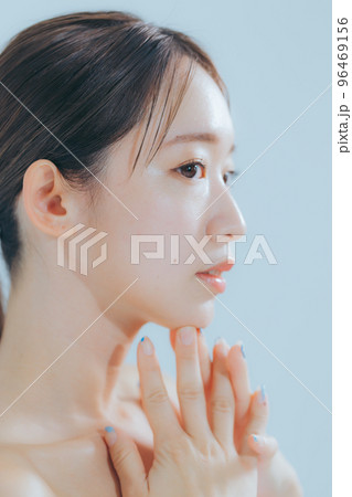 美容やビューティーに 輝く美しい肌でカメラ目線のアンニュイな表情の色っぽい女性 クローズアップの横顔