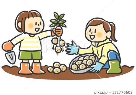 収穫したじゃがいもを左手で持つ女の子とじゃがいもを集めてボウルに入れる女性