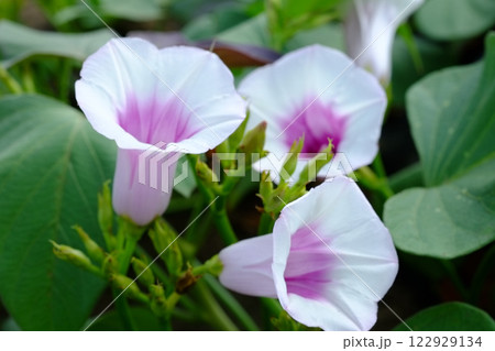 真夏のサツマイモ畑のサツマイモの花 薩摩芋の花 さつまいもの花