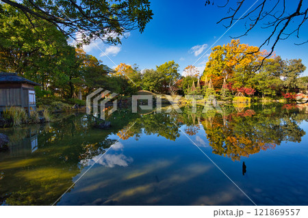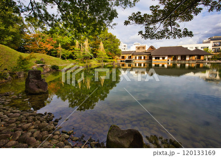 養浩館庭園の雪吊りと紅葉風景