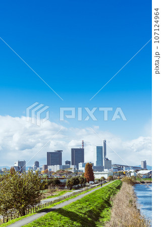 「埼玉県」見沼田んぼから見る、爽やかな秋空とさいたま新都心
