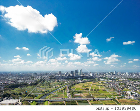 「埼玉県」見沼田んぼから望む青空とさいたま新都心