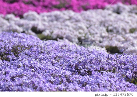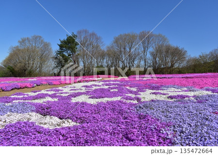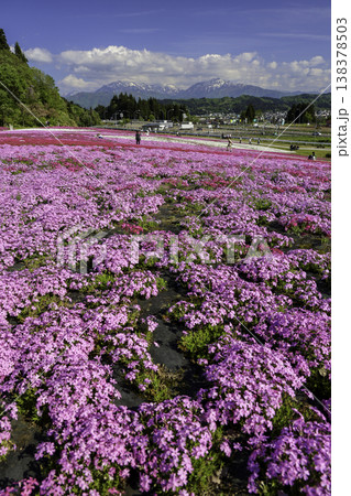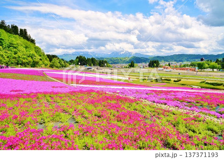 早春に咲く新潟県魚沼市堀之内根小屋花と緑と雪の里の公園の満開の芝桜