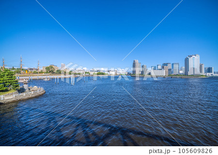 日本の東京都市景観 相生橋から豊洲水門や豊洲、屋形船(新浪)などを望む