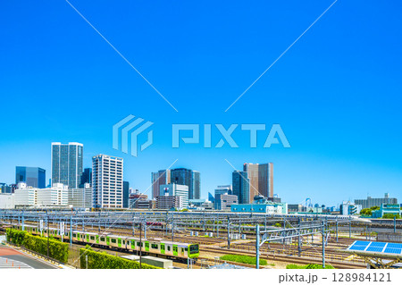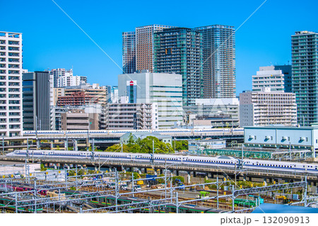 日本の東京都市景観 新幹線や山手線、芝浦アイランドケープタワーなど芝浦のタワーマンション群を望む