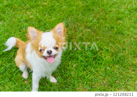 ドッグランで元気に走るチワワの楽しそうな笑顔