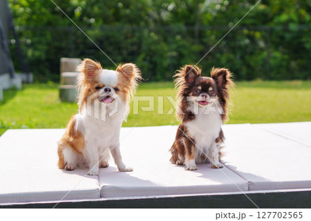 公園の芝生の上で並んでオスワリをする二頭のロングコートチワワ