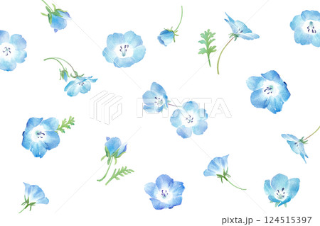 春の花:小さなネモフィラの花の水彩イラスト。背景模様。
