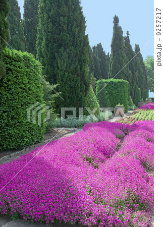 lawn of crimson flowers among cypresses