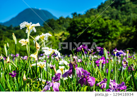 菖蒲咲く神楽女湖と由布岳(別府市)