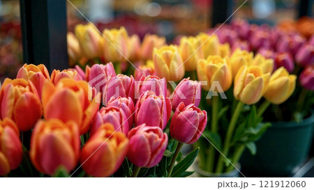 A close-up view of a flower market stall filled with vibrant orange, pink, and yellow tulips, blurred glassdoor on the background