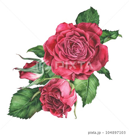 Watercolor botanical illustration. Composition of pink roses. Hand drawn red flowers and leaves. Isolated on a white background.Clip art sticker with flowering plants.For the design of greeting cards