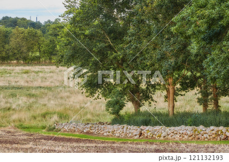Beautiful landscape of countryside outdoors on a summer day. Peaceful and scenic nature with lush green trees and bush. Forest with brown dry grass or field on a spring morning o a farm