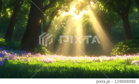 serene forest scene with sunlight streaming through trees, illuminating vibrant meadow filled with colorful flowers. atmosphere is peaceful and enchanting, inviting sense of tranquility