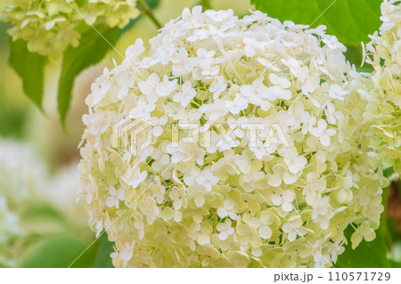 Beautiful little white flowers. Green leaves background vignette with white flower