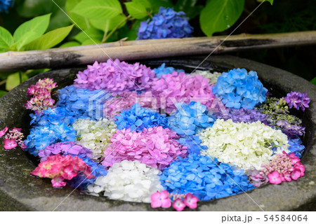手水鉢に浮かべた紫陽花 日本の夏の風景