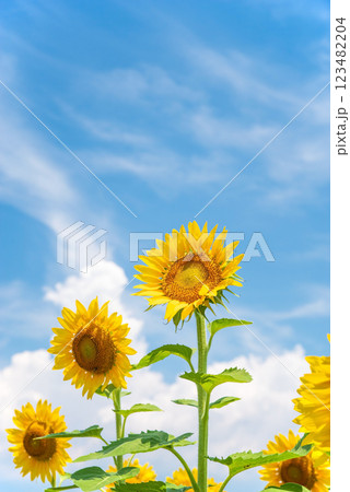 青空に映える元気なひまわりとヒマワリの花の上に飛ぶ蜂