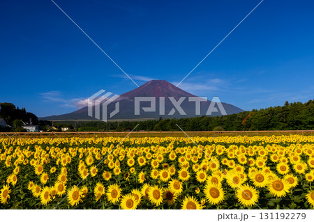 山梨県南都留郡山中湖村山中 花の都公園の満開のひまわり畑と青空の富士山