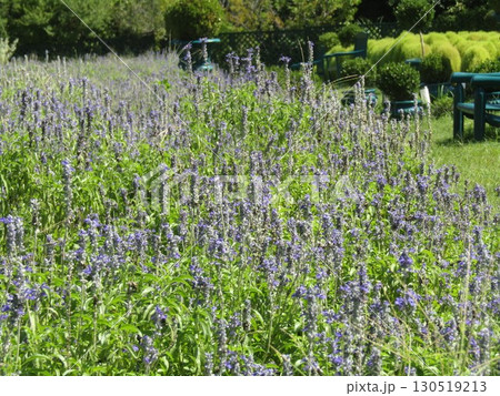 花の美術館前庭のビオラのオレンジ色と青色の花