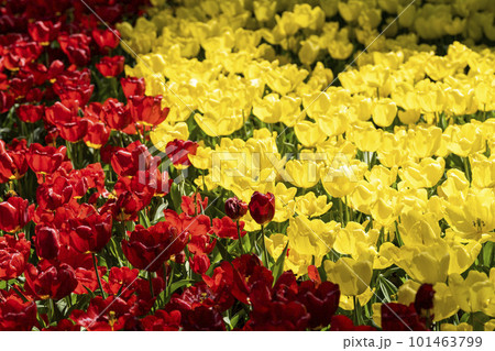 一面に咲く黄色いチューリップの花畑 ストロングゴールド