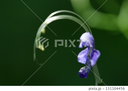 朝の雫とヒメシャガの花。花言葉は「隠れてる私を見つけてください」。