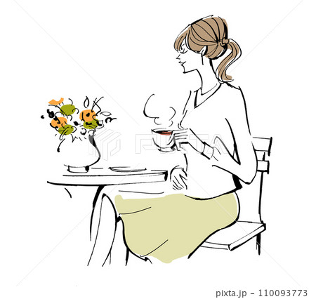 コーヒー カフェ 女性 楽しむ テーブル椅子 喫茶店 休憩 カフェでお茶をする女性のイラスト