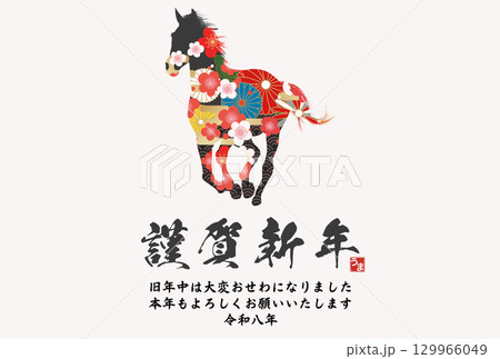 年賀状2026 午年 馬のイラストのおしゃれな年賀状 和柄 花柄