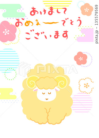 お辞儀する羊と[あけましておめぇ〜でとうございます]の文字のかわいい2027年未年年賀状(文章なし)