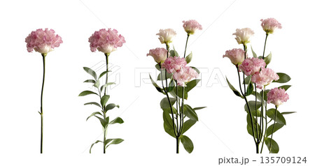 Carnation flower set with pink petal bloom, tender delicate beauty, stems and branchs, leaf greenery