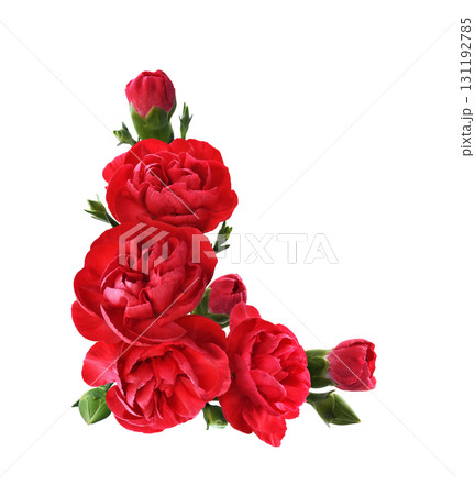 Red carnation flowers with green buds in a corner floral arrangement isolated on white background