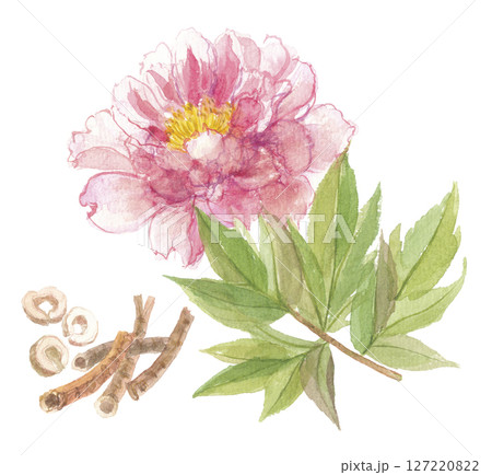 水彩で描いた牡丹の花と根 牡丹皮 ボタンピ