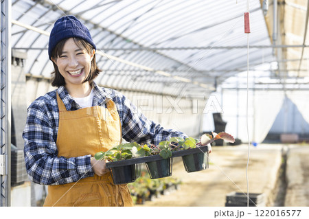 いちごの苗を育てる女性