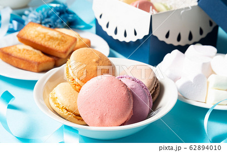 洋菓子いろいろ マカロン フィナンシエ マシュマロ スイーツ 水色