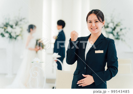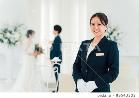 結婚式場・ホテルで働くスーツ姿のコンシェルジュ・ホテルマン・ホテリエ・ウェディングプランナーの女性