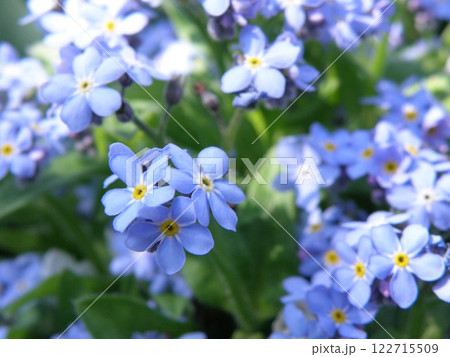 Soft focus close-up of delicate blue forget-me-not flowers blooming in a lush green spring garden, creating a serene and beautiful natural scene